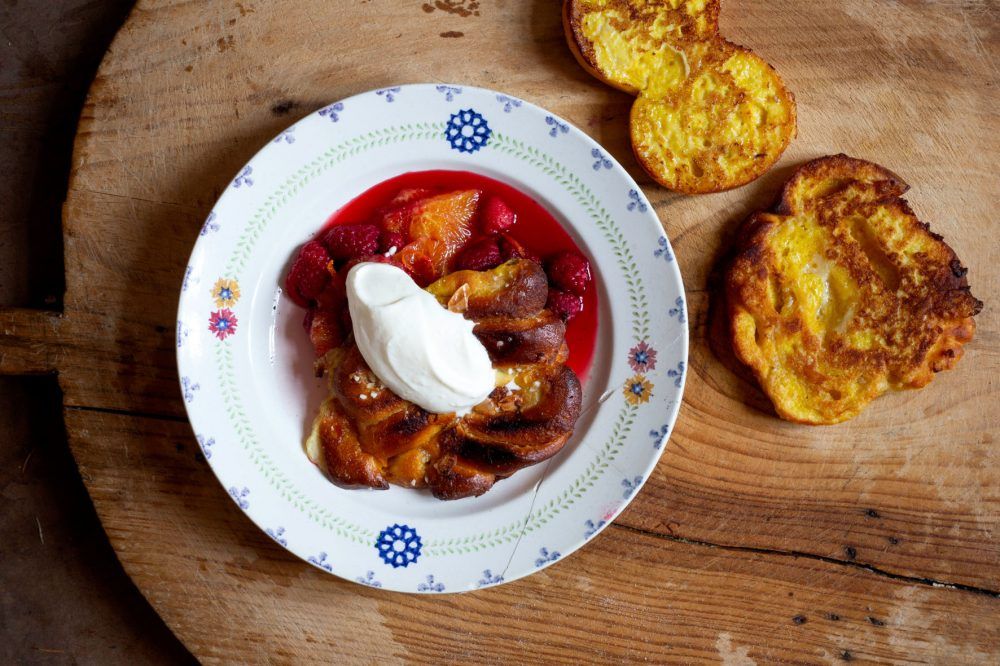 Till dessa frasiga, nygräddade riddare vill vi ha vispad grädde och något fruktigt. Sylt är såklart gott men en kompotten på apelsin, hallon och vanilj är den optimala smakkompisen till saffran.