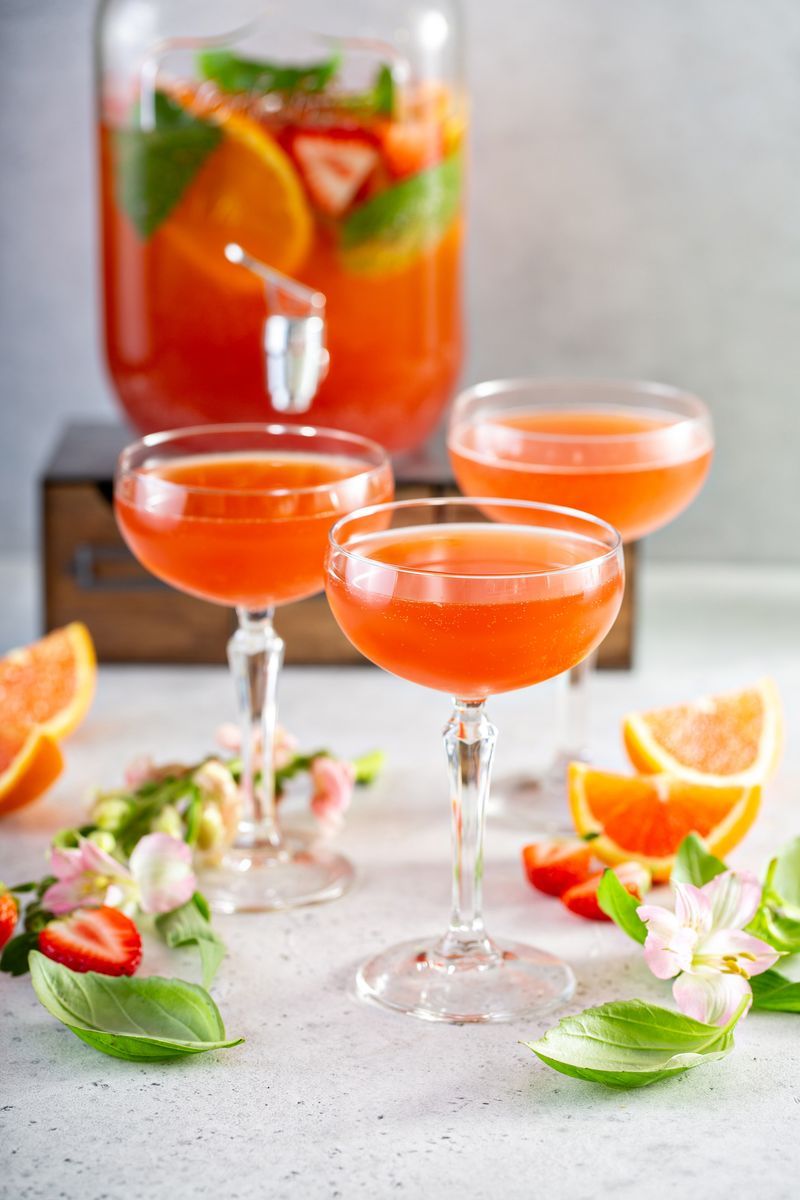 En alkoholfri drink med jordgubbar, basilika och blodapelsin.