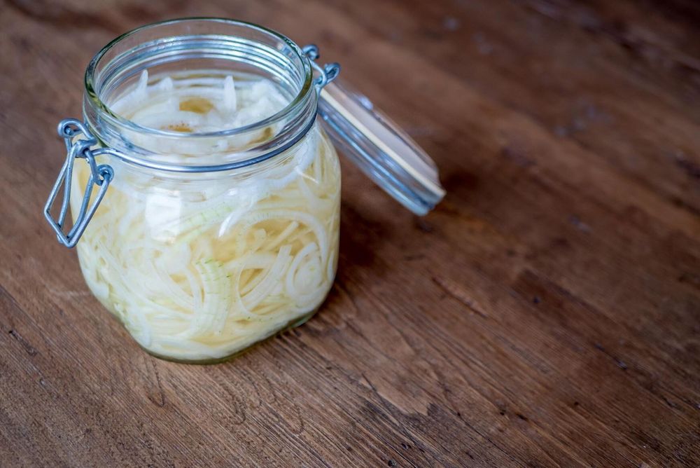 Senapsfrön, kryddnejlikor och kryddpeppar ger smak åt den här syltade löken. En burk sommar att ta fram när det kommer bistrare tider.