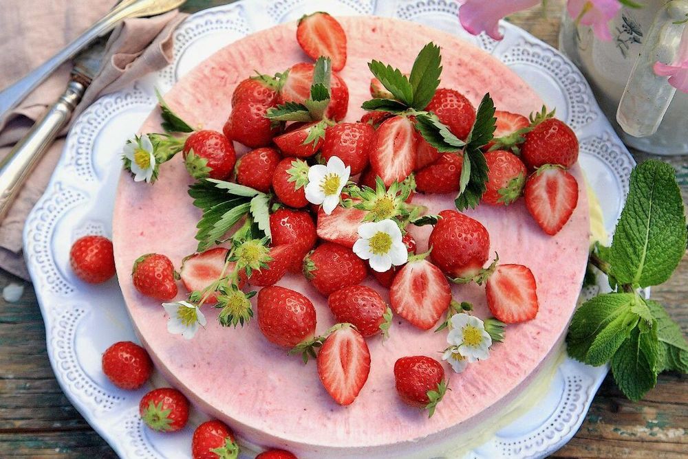 Praktisk och drömgod midsommartårta som du gör i god tid, för den här moussetårtan ska frysas. Den påminner om en somrig glasstårta.