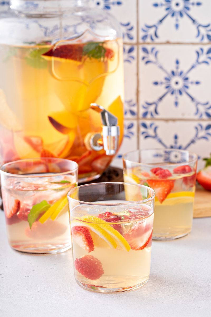 Underbart frisk och fräsch är vit sangria med vitt vin, Sprite, citron, persika och jordgubbar.Foto: Istock