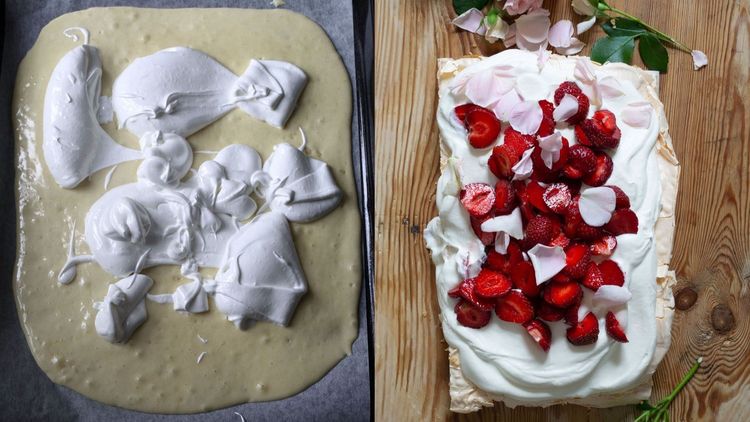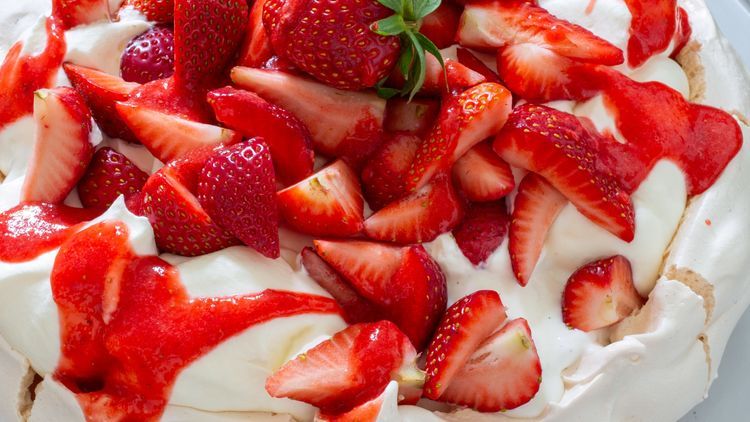 Maräng, grädde och ett berg av jordgubbar. Midsommarens godaste efterrätt är en enkel men ack så god pavlova!