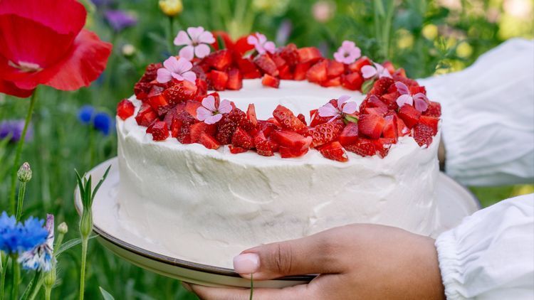 Jordgubbar är sommarens stora måste – och en jordgubbstårta på midsommar är alltid ett säkert kort!