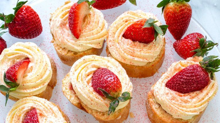 Det här är en riktig klassiker med fluffiga vaniljbottnar, färskostfrosting och färska jordgubbsbitar.