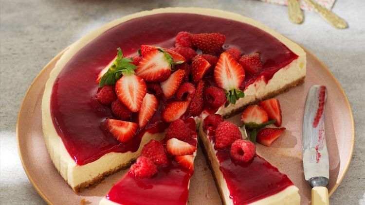 Amerikansk cheesecake möter svensk sommar. Spröd botten, bakad och krämig cheesecakefyllning och en ljuvlig jordgubbssås. Mums!