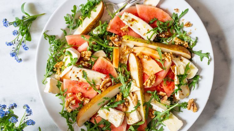 Fräsch och urgod sallad som både kompletterar och mättar. Härlig smakbrytning med päron och valnötter till melon och ost.