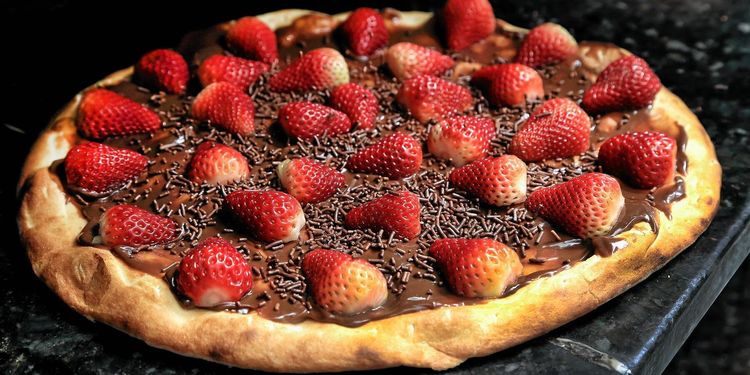 Pizza med söt botten, hemmagjort Nutella, färska jordgubbar och riven vit choklad – en dessertdröm!