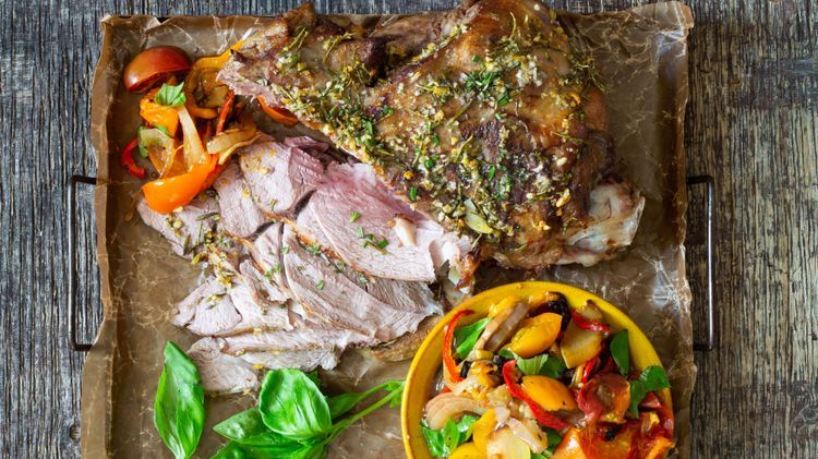 Underbart mör och saftig lammstek med smak av vitlök, rosmarin och citron serveras här med en god grönsaksröra med bland annat zucchini och aubergine.