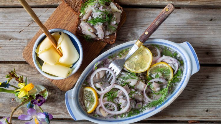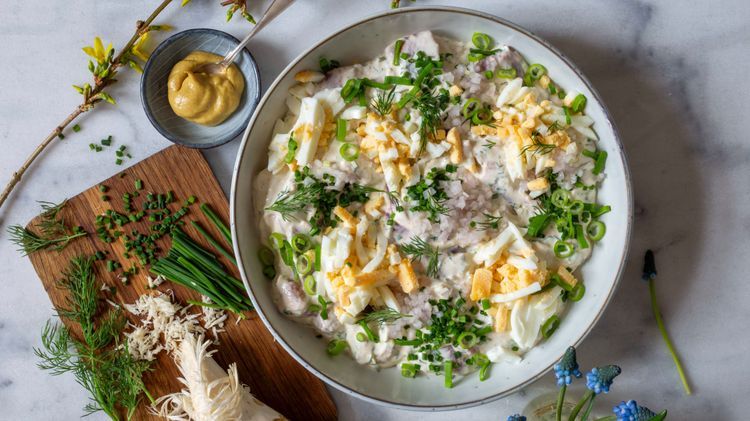 Matjessill – ett måste på påskbordet. Den här varianten ger en krämig sill med smak av senap och pepparrot.