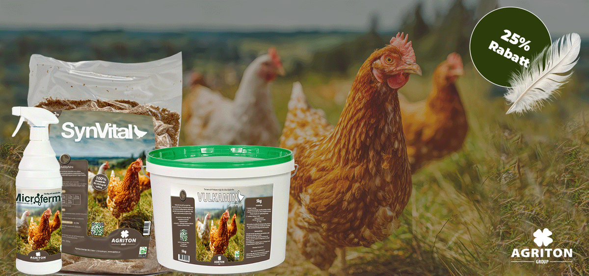 Hälsa i både mage och hönshus för alla våra fjäderfä. Produkterna stödjer tarmfloran, minskar lukt, ammoniak och kvalster - och skapar ett renare, mer välmående hönshus. Helt naturligt - utan kemikalier! Passar alla fjäderfä! I lucka 16 får du 25% på hönsserien från Agriton.