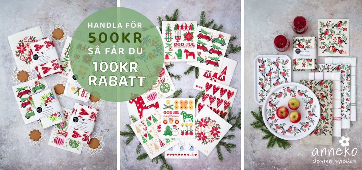 Handla för 500 kr i webbshoppen och få 100 kr rabatt. Skapa julstämning med hållbar svensk design – disktrasor, kökshanddukar, brickor eller gåvoset.