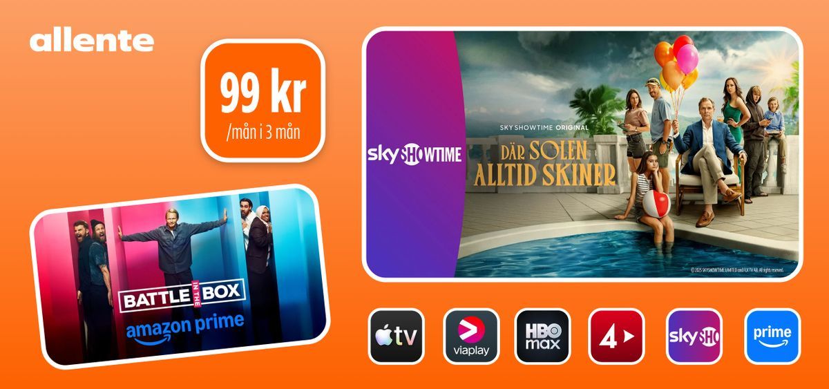 I paketet ingår 2 valfria streamingtjänster och 19 populära tv-kanaler. Välj fritt bland populära streamingtjänster som Skyshowtime och Amazon Prime – och byt ut dem varje månad!