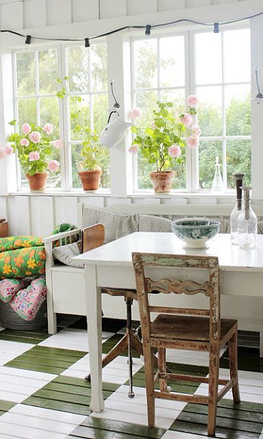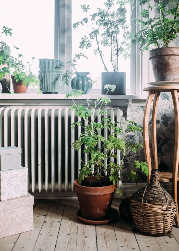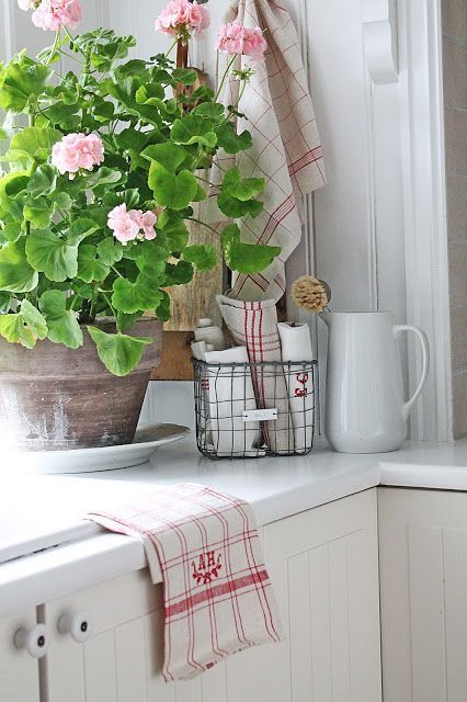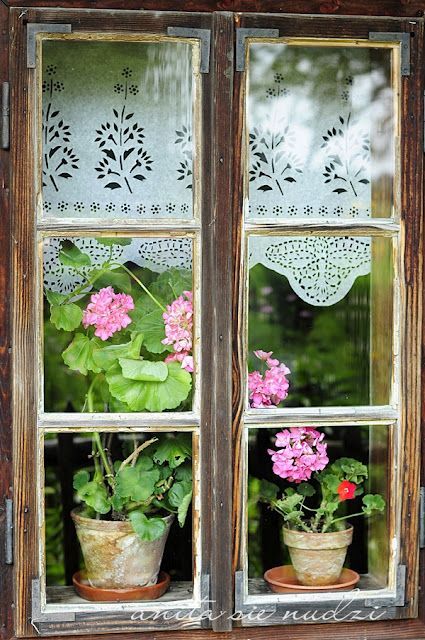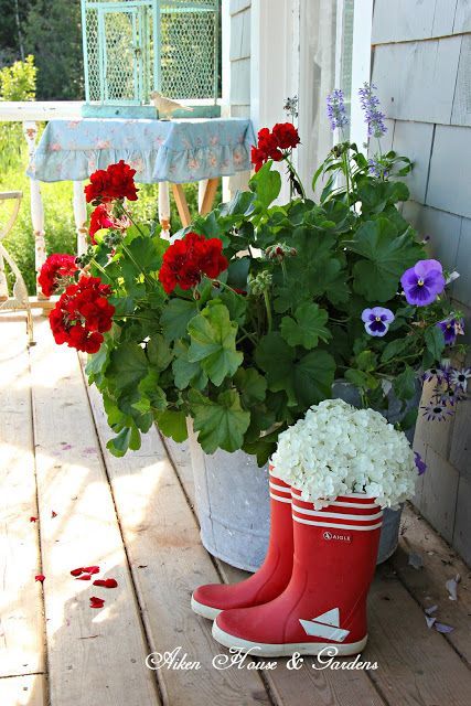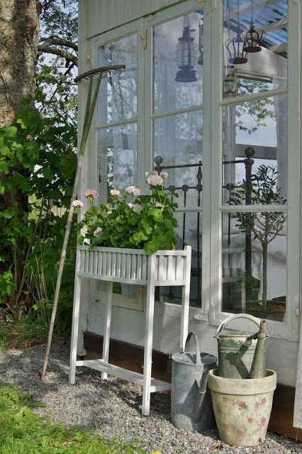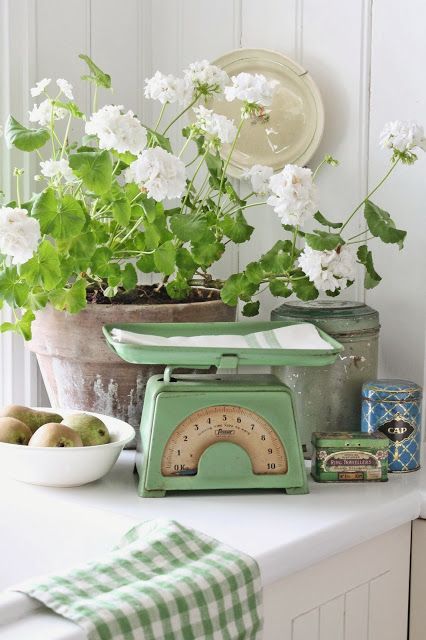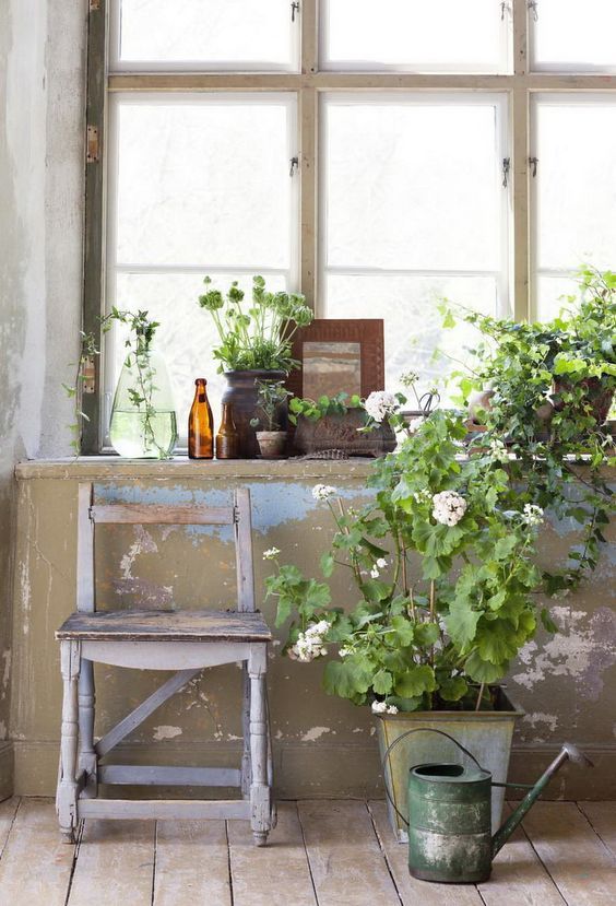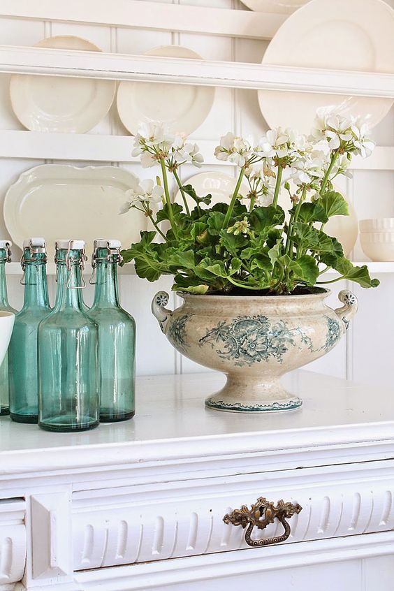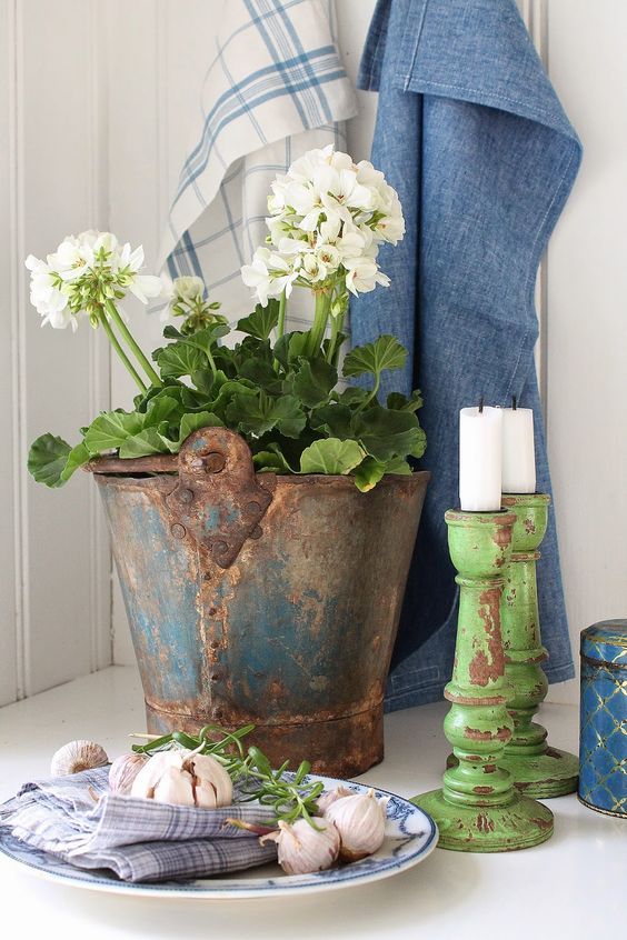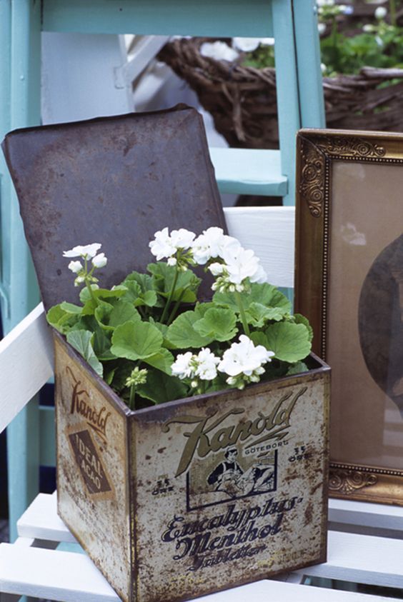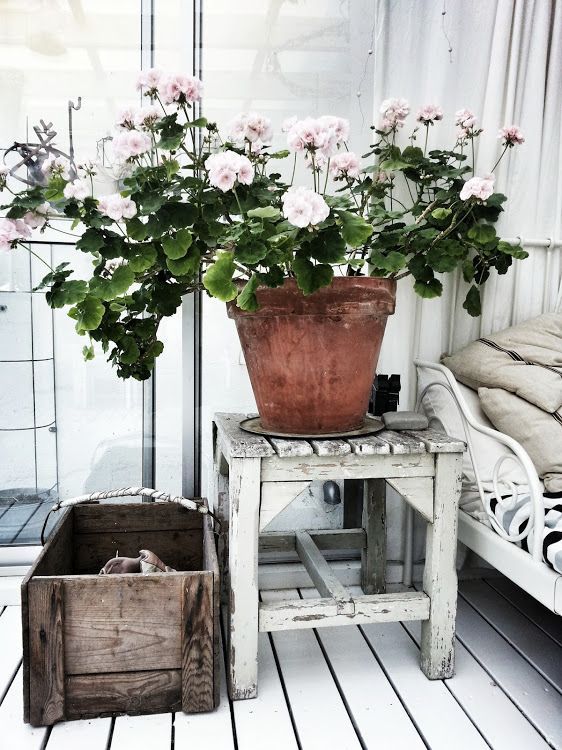 En gammal, välväxt pelargon förtjänar en extra fin åldrar kruka. Orkar du inte vänta på att krukan ska bli så här fin? Pensla den med en blandning av släckt kalk och vatten, låt torka och sandpappra krukan tills du har lagom mycket vit beläggning kvar. Källa