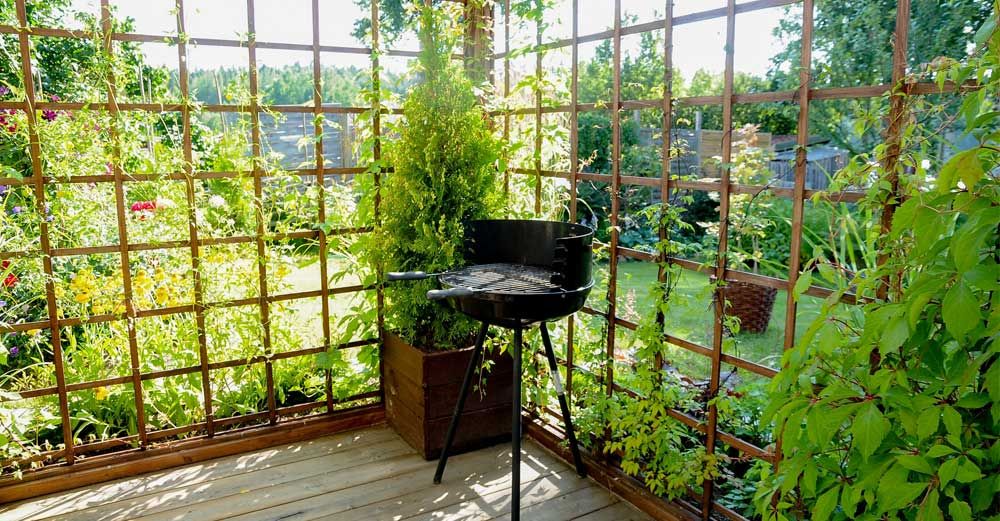 Ett orangeri i all ära, men varför inte skippa glaset och och rama in trädäcket med spaljéväggar i stället. Snyggt OCH praktiskt, eftersom du kan vara social med middagsgästerna samtidigt som du står och grillar.