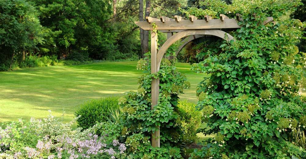 En pergola med spaljé är ett vackert inslag i den lite större trädgården.