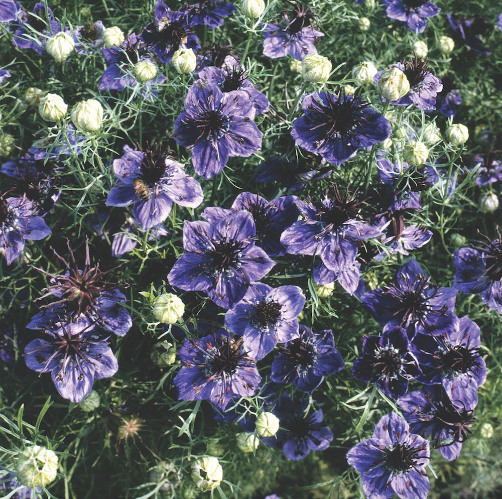 Det är inte blåklint men färgen stämmer. Jungfrun i det gröna ‘Midnight’ har blå blommor som svävar över finflikigt bladverk. Kompakt växtsätt för rabattkanter och krukor, fin som snittblomma. Blir cirka 50 centimeter och får direkt magiska fröställningar. Direktsås i april–juni, blommar juli–september. Ettårig. Rara växter.