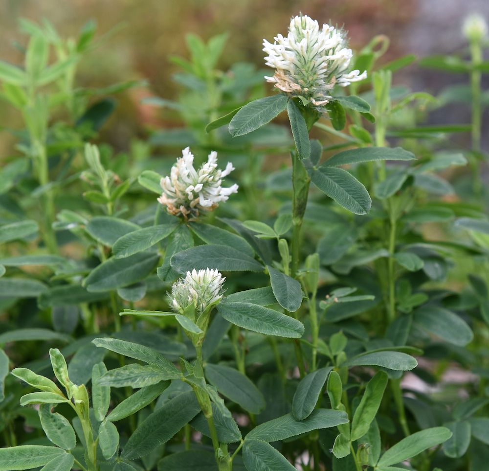 Vit purpurklöver ’Frosty Feathers’ blommar fint i t ex stenpartier med vita toppiga klöverblommor som följs av dekorativa, silverrosa fröställningar. Förkultiveras i februari–mars, direktsås i maj–september. Blommar i juni–augusti. 40 centimeter hög och flerårig. Impecta.