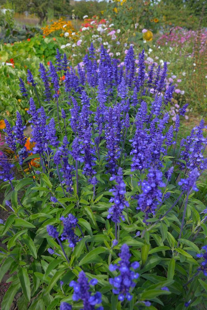 Daggsalvia ’Sirius’ blommar rikt i mörkblått över ett tätt och friskt bladverk. Flerårig.