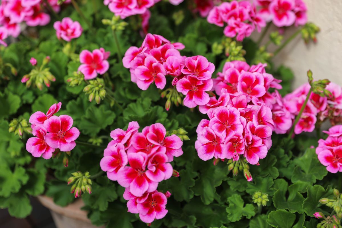 Årets pelargon 2026 syns på långt håll trots sin blygsamma storlek. De korta blomstjälkarna höjer blomknippen med små trefärgade blommor bara en aning över ett kuddformat lövverk med mörkt gröna och blanka blad.