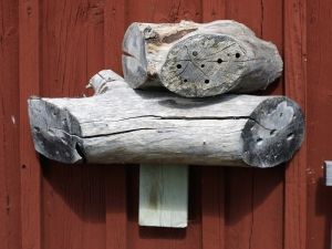 4. Bibo från Ikea. Här är det borrat och klart. Hålen i sidstycket från en gammal lagerhylla fungerar som bo för vilda bin fast hålen är grundare än man brukar rekommendera. Mitt i sitter en hummelholk.