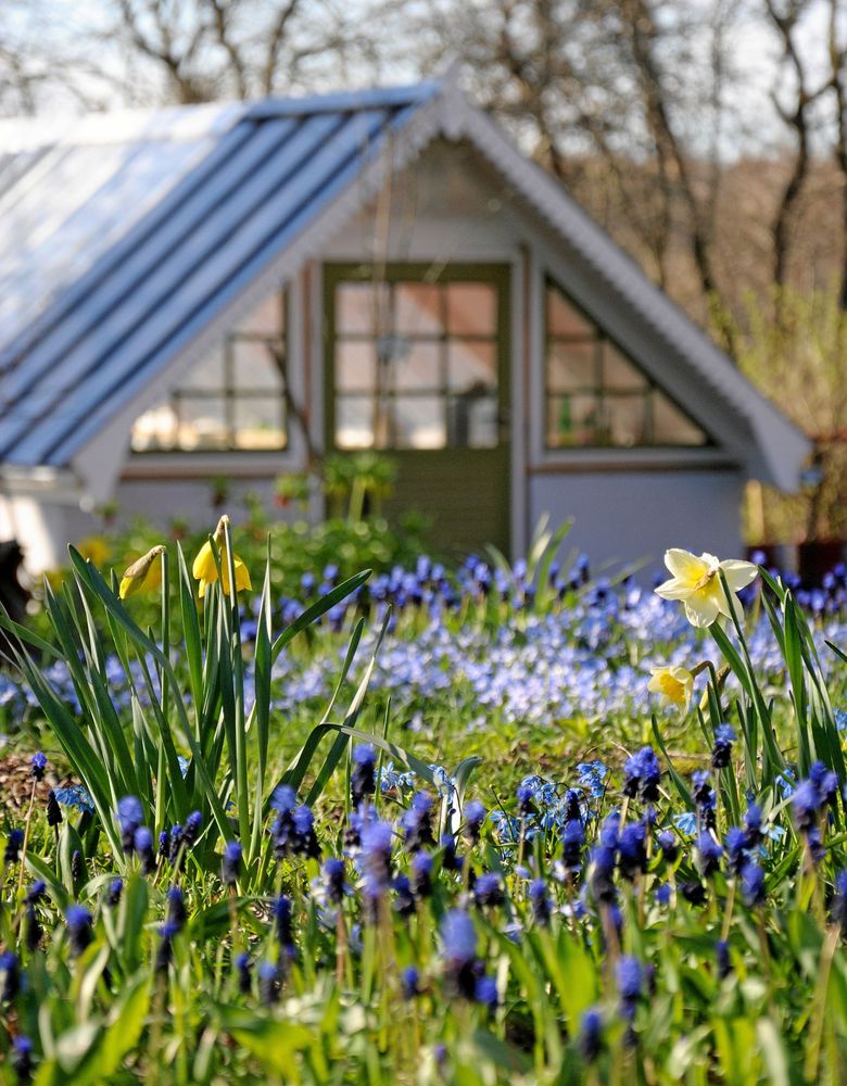 Hos Hjördis Blomberg är det som allra finast på våren när lökväxterna avlöser varandra i sluttningen ner mot det vita växthuset med den gröna dörren.