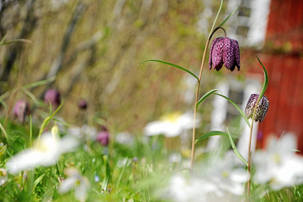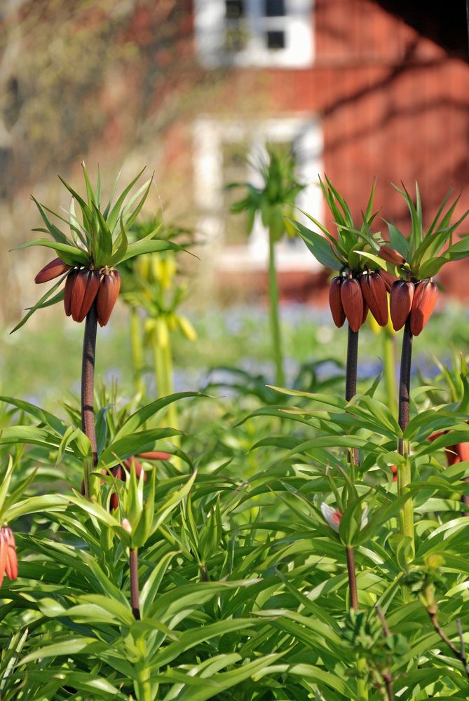 I maj kommer kungsängsliljorna och gullvivorna. Det är färggrant så det förslår. Blå förgätmigej hjälper till. Och det är knappt att de stora, vräkiga kejsarkronorna, som står längre ner mot växthuset och övervakar föreställningen kan ta upp kampen om uppmärksamheten.