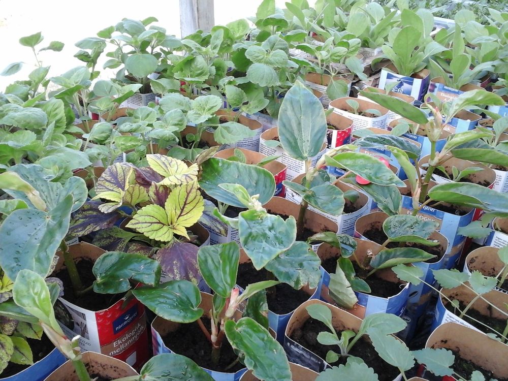 Stor tomt på gammal jordbruksmark. Trädgården innehåller planteringar med perenner, buskar och sommarblommor, krukor och amplar med fuchsior och dahlior. Här finns potatis- och grönsaksland, bärbuskar och växthus med tomater och gurka.