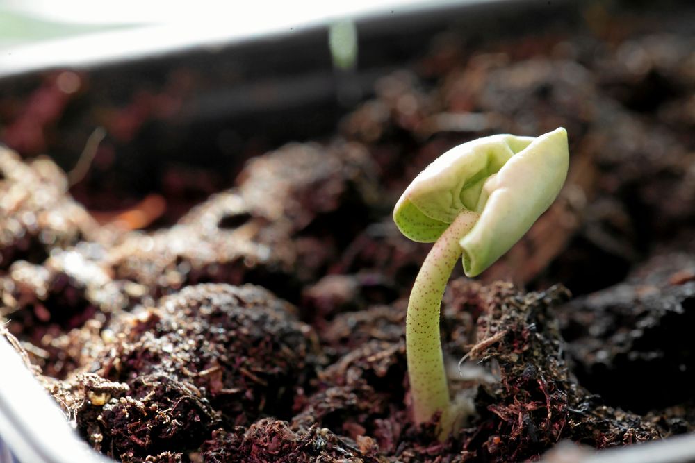 Efter 2-4 veckor tittar de första små bladen upp och redan nu anar man att det kommer att bli en kraftfull planta.