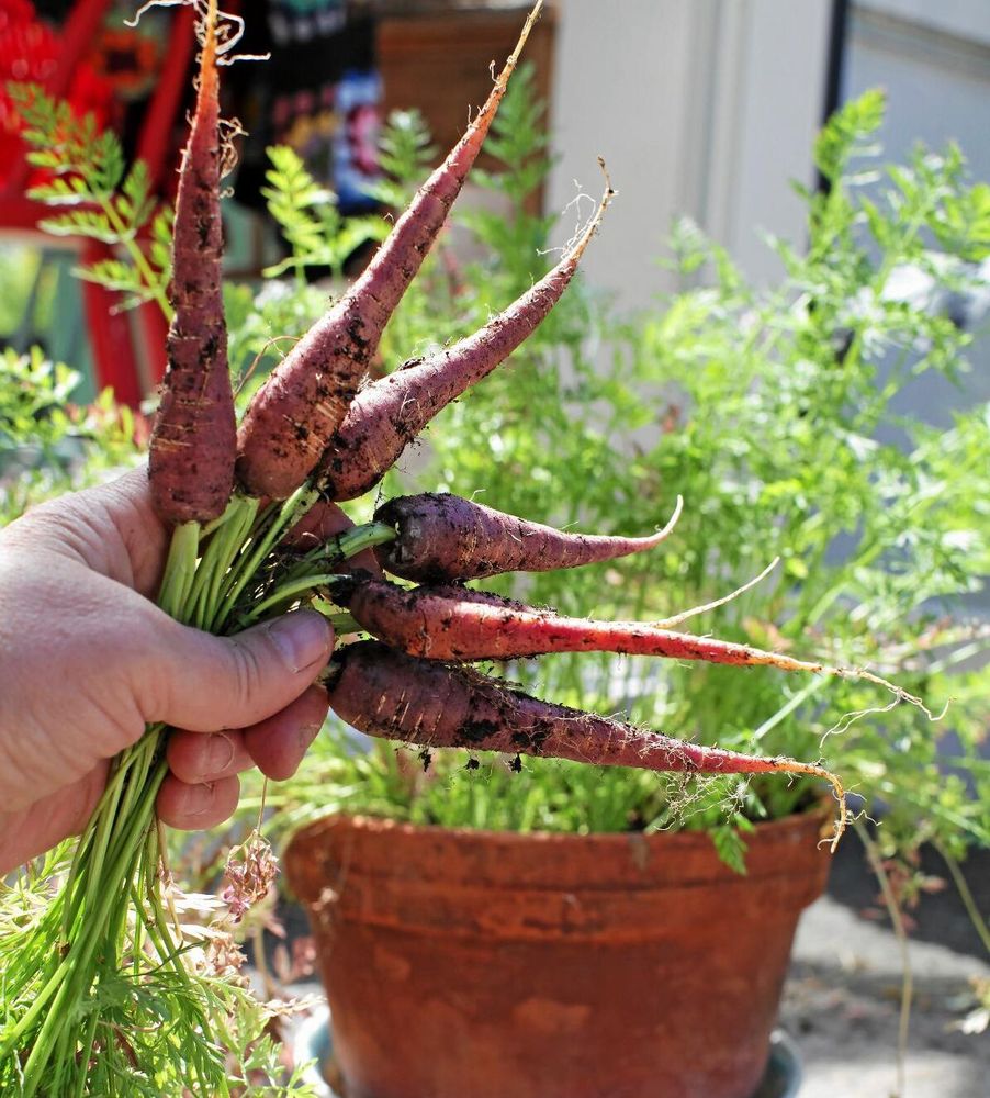 Tyvärr får man vänta minst fyra månader på riktigt fullvuxna morötter, men redan efter två månader kan du gallringsskörda små primörer. Glesa ut avståndet mellan de som är kvar till tre, fyra centimeter.