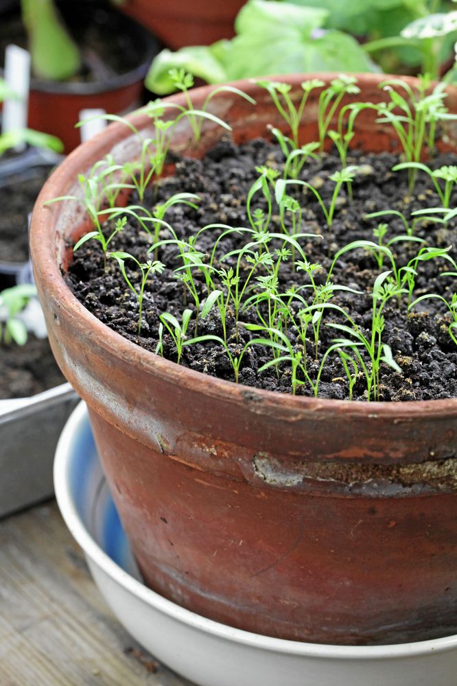Låt gärna krukan, även om den är av plast, stå i en skål hela odlingsperioden så den får en underbevattning och lockar rötterna neråt. När plantorna kommit upp kan du vattna från båda håll.