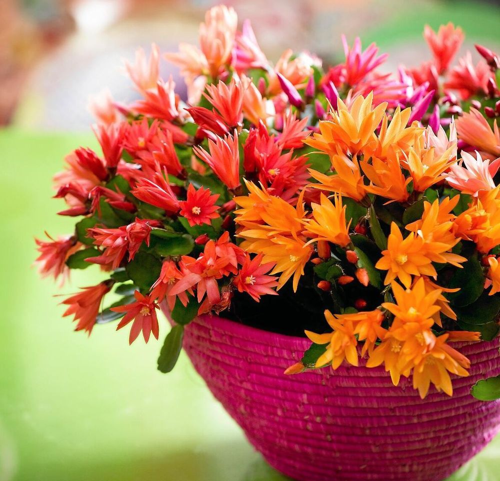 Påskkaktusen blommar i rött, brandgult, rosa, gult och vitt.