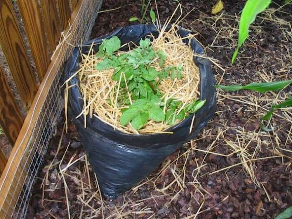 Det behövs inga tjusiga specialpåsar för potatisodling. Det duger lika bra med en vanlig sopsäck. Plasten håller kvar fukten och svärtan drar åt sig av solvärmen.