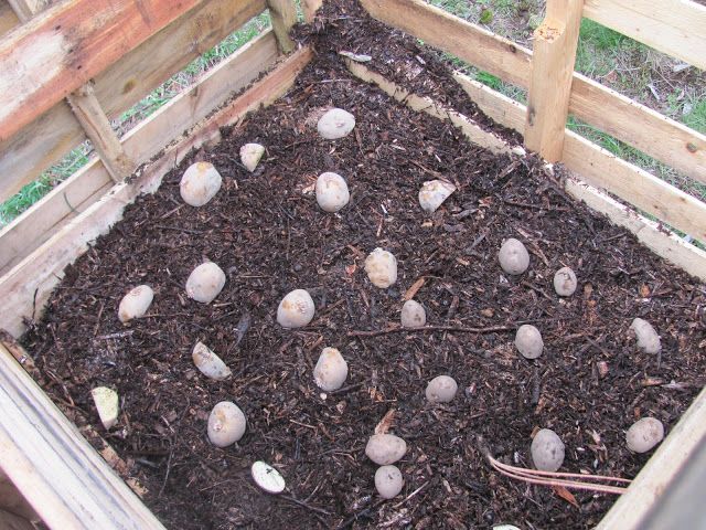 Lägg potatisar med groddarna uppåt på jorden och lägg på ett lager jord ovanpå.