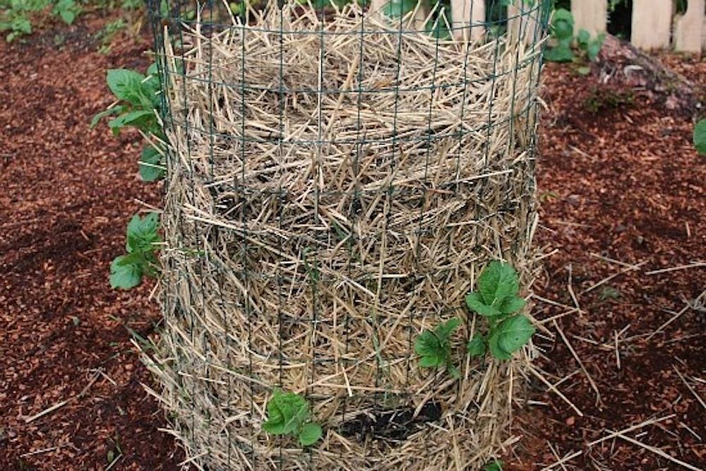 Ett torn av nät kan ge både potatis och salladsvirke. Gör en tub av metallnät och fodra botten och sidan med halm. Häll jord i mitten och lägg potatisar vid kanten med groddarna utåt.