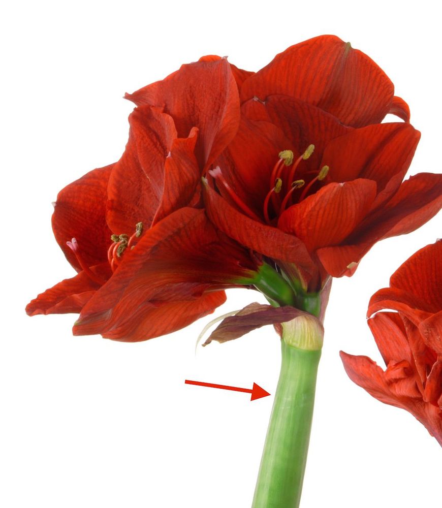 Allt är luftens fel och florister har ett smart knep som hjälper. Amaryllisens långa ihåliga stjälk kan inte dra upp vatten i stjälken som är fylld med luft.