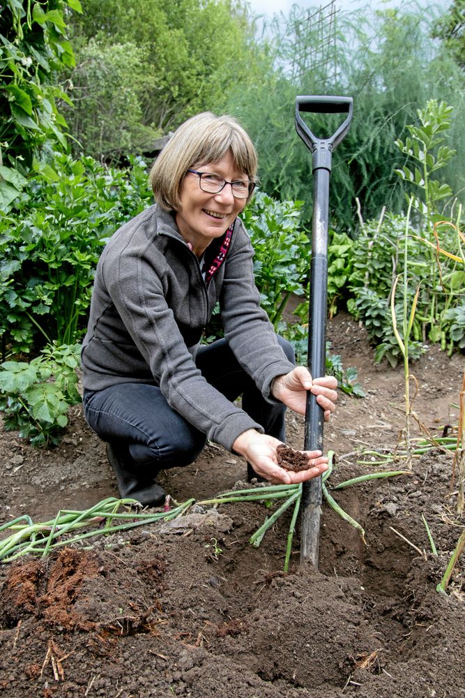 – Jag lägger grovt och lite osorterat trädgårdsmaterial i botten, sedan ett lager kogödsel som vi får från en grannbonde. På det halm eller klipp från trädgården och så den bortgrävda jorden på toppen, berättat hon, och visar hur djup och lucker matjorden är genom att ta ett tag med spaden som sjunker ner nästan som av egen kraft.