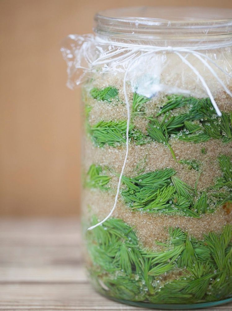 Varva 5 deciliter strösocker eller råsocker med 5 deciliter granskott i en glasburk. Låt stå i ett soligt fönster tills sockret smält. Sila bort skotten och häll upp i en ny ren burk.