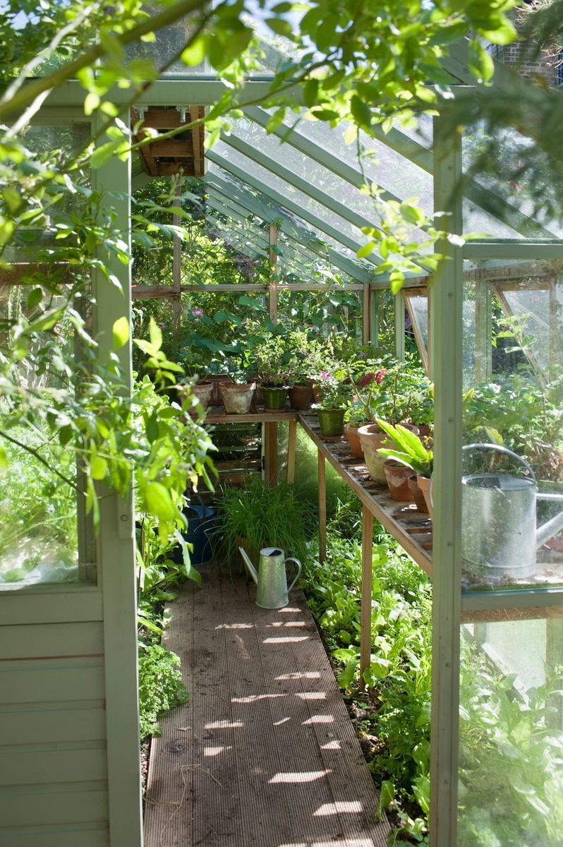 Tänk i lager. En jordbädd kan till exempel rymma bladgrönt och låga växter samtidigt som en hylla ovanför ger plats för växter i kruka, odlingstråg och jordfyllda brödbackar. Använd också hela växthusets höjd genom att leda upp höga plantor på växtstöd och linor uppe under taket.
