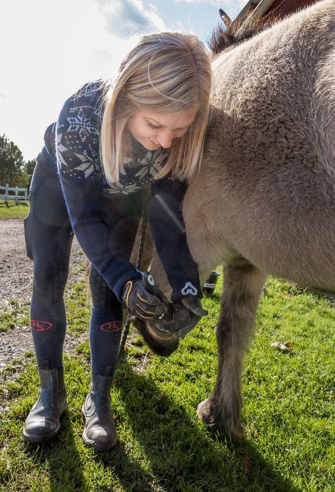 – Om jag kan vara ledig? Knappast. Det finns alltid att göra. Tvätta schabrak, verka och raspa hovar, fixa i stallet, mocka, bokföra. På somrarna tvättar jag stallet invändigt och ofta målar jag i och utanpå någon ekonomibyggnad.